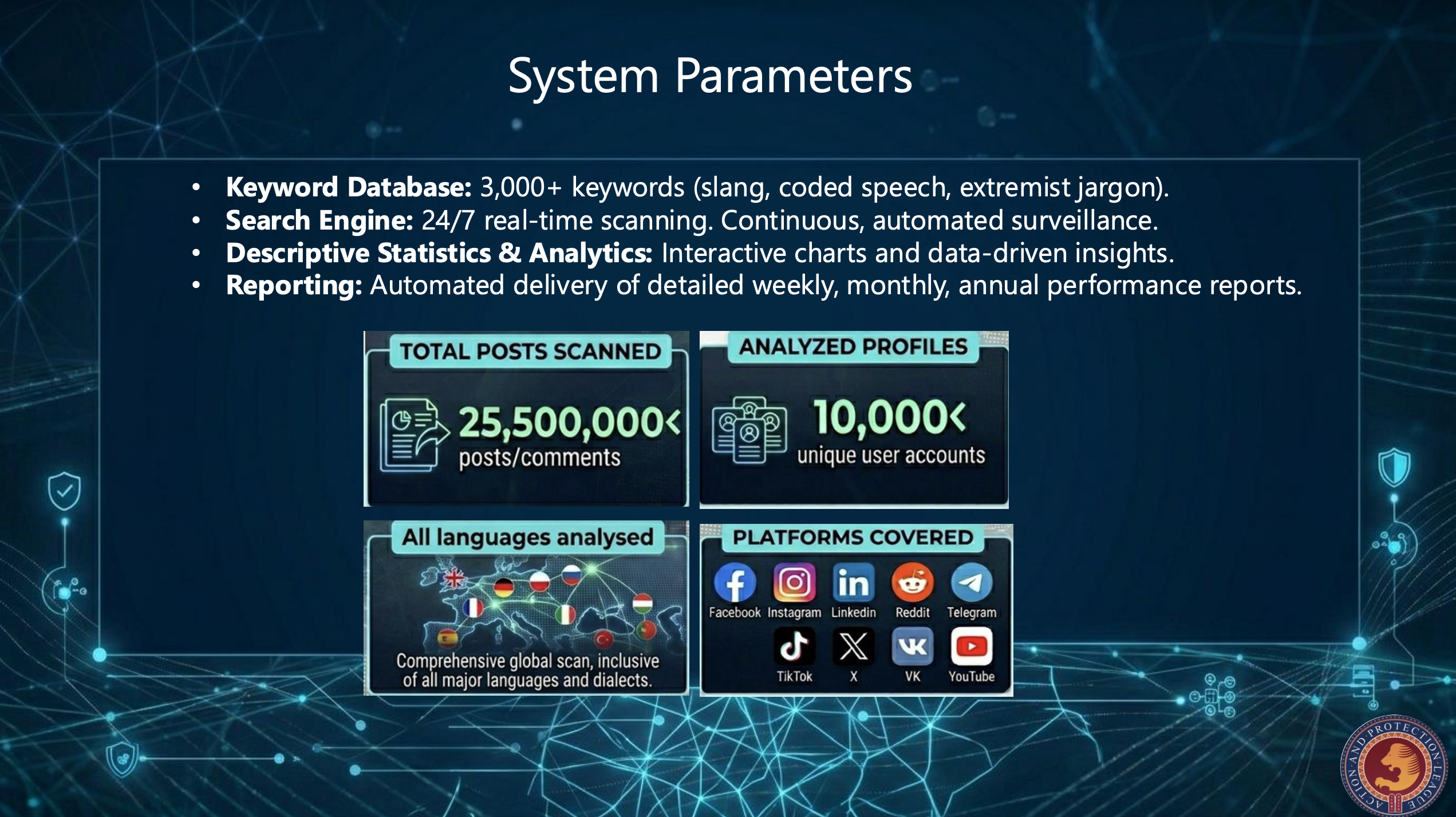 The software is capable of automatically collecting, filtering, and analyzing billions of posts and comments across major social media platforms—including Facebook, Instagram, YouTube, TikTok, and X—based on hundreds of predefined keywords. It identifies and categorises antisemitic content according to the seven categories defined by the OSCE, and organises the data into a structured database, enabling analysis, reporting, and, where necessary, legal or security responses.